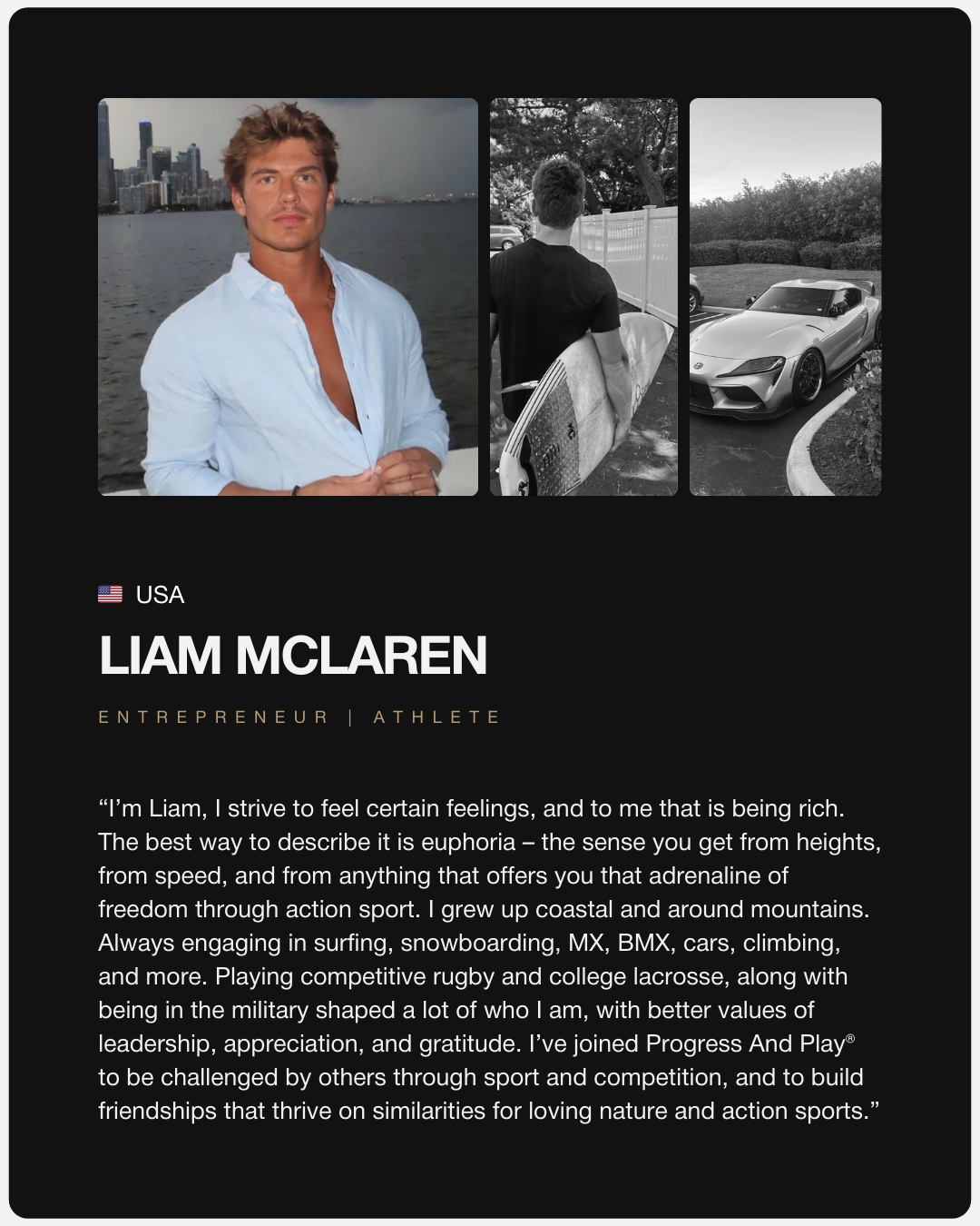 A Progress And Play® Experience is a Curated Sports & Adventure Experience made for Ambitious and Sporty men to feel more connected, alive, capable, and fully themselves.