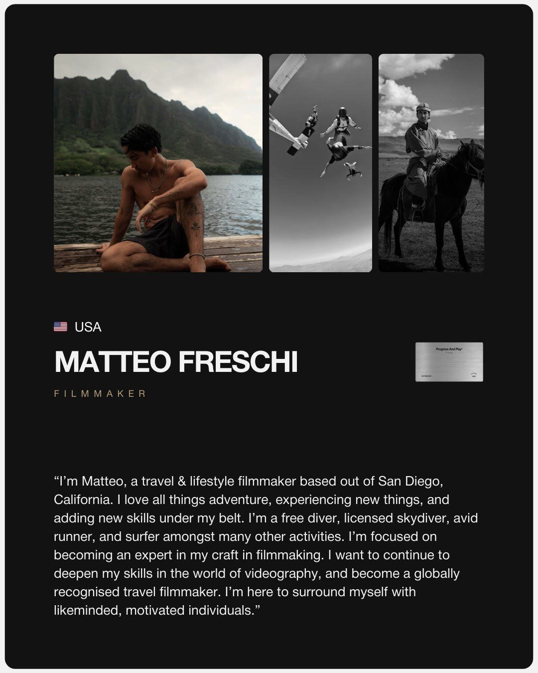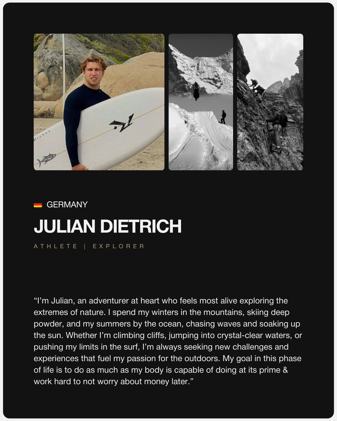 Our current network includes: Professional athletes, entrepreneurs, founders, multi-sport athletes, creators, filmmakers, explorers and more.